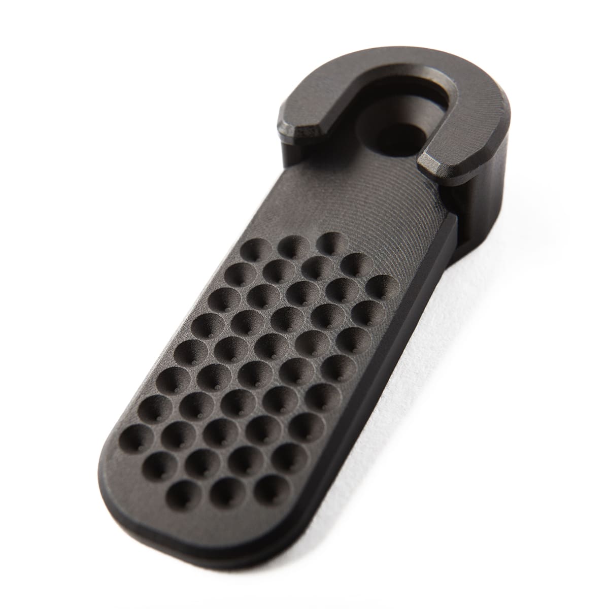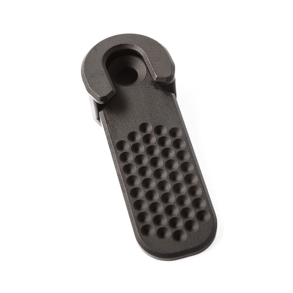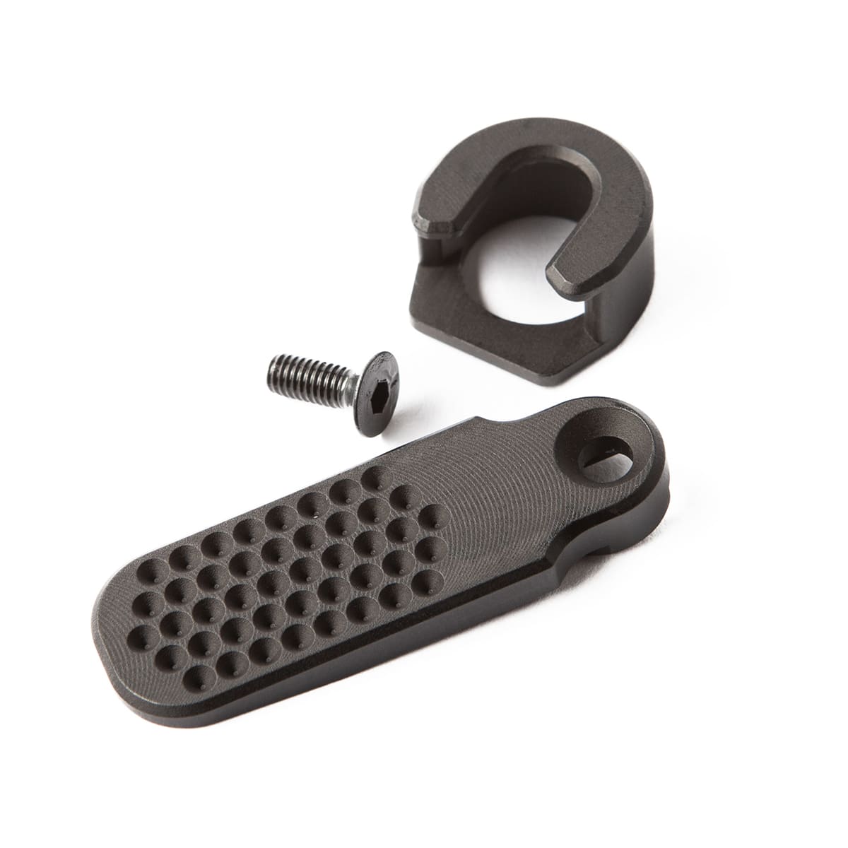 When the factory latch is pivoted rearward, it activates the shell stop, releasing multiple shells into the gun’s receiver and locking up the action. The shroud, originally conceived by Tom Jones of Tau Development Group and pistol-forum.com and redesigned by Aridus Industries, covers the rear of the redesigned latch to prevent rearward actuation from accidental bumps.