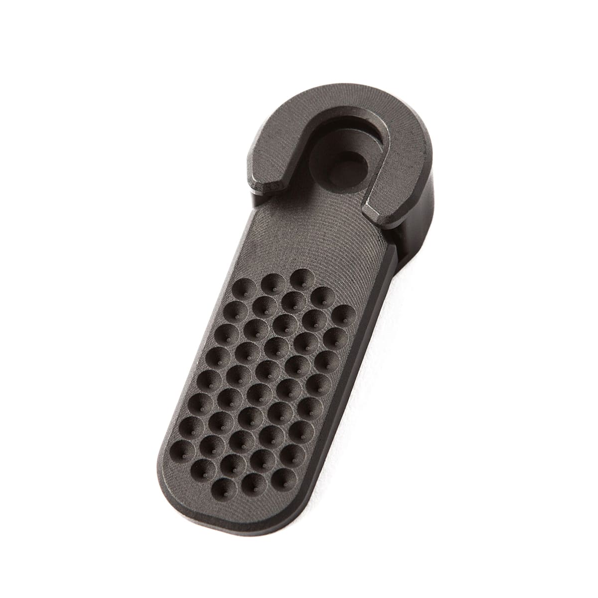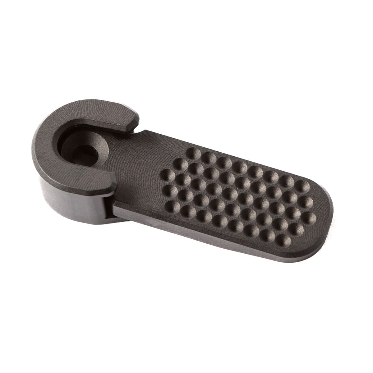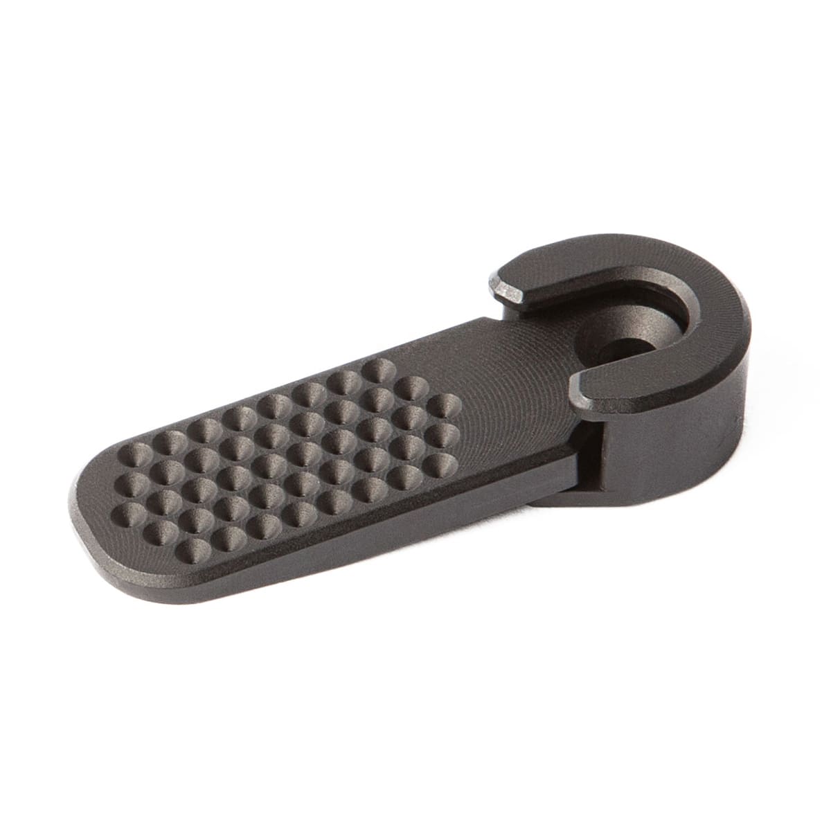 When the factory latch is pivoted rearward, it activates the shell stop, releasing multiple shells into the gun’s receiver and locking up the action. The shroud, originally conceived by Tom Jones of Tau Development Group and pistol-forum.com and redesigned by Aridus Industries, covers the rear of the redesigned latch to prevent rearward actuation from accidental bumps.