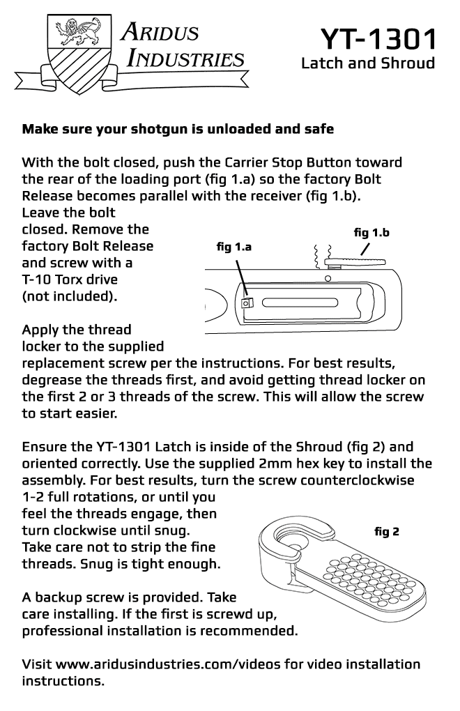 The YT-1301 is a latch and shroud to be used with the First Generation Beretta 1301 in order to address the potential of the catastrophic shell dump malfunction. Both the Latch and Shroud are machined from 6061 aluminum and Type III hard coat anodized. The YT-1301 comes with the Latch, Shroud, two (2) screws (in case one becomes damaged or stripped), thread locker, and a hex key for installation.